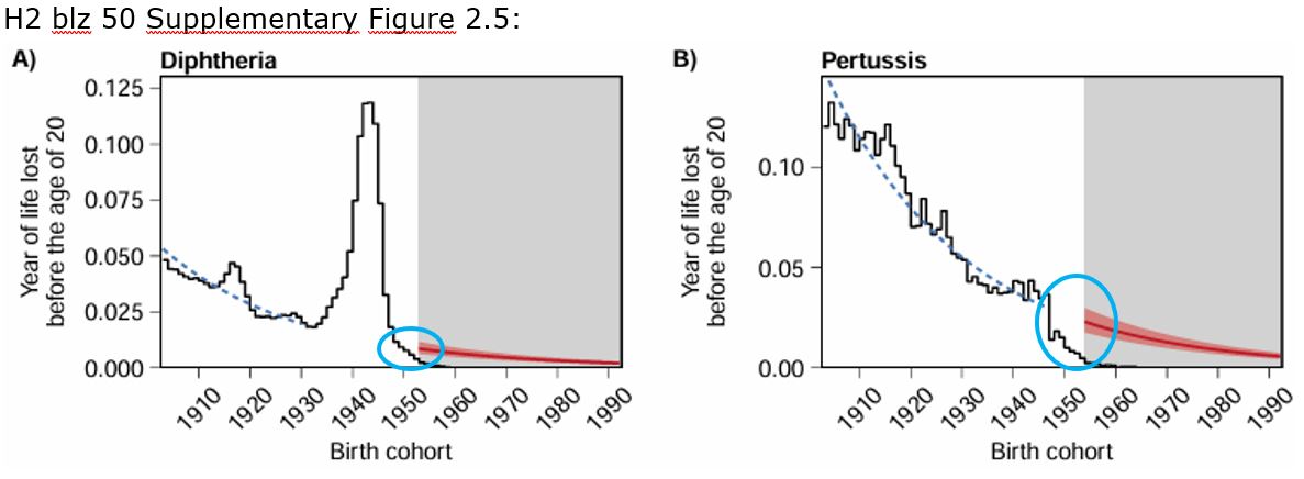 Verder is in het onderstaande figuur 2.5 uit het onderzoek van Van Wijhe te zien dat de extrapolatie (rode gebied) niet aansluit bij de feitelijke ontwikkeling voorafgaand aan de invoering van de massavaccinatie. Met als gevolg een (mogelijk forse) overschatting van het aantal sterfgevallen dat is voorkomen door de invoering van de difterie massavaccinatie.
