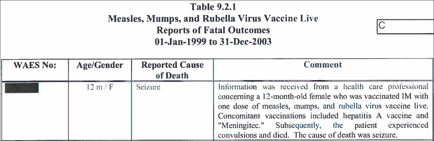 In de Periodic Safety Update Reports (PSUR) zijn meerdere voorbeelden te vinden van overlijdensgevallen na vaccinatie die zijn geregistreerd door Merck bij het post-marketinggebruik van M-M-RVAXPRO. De afkorting M-M-R staat voor Mups-Measles-Rubella in het Nederlands is dat Bof-Mazelen-Rodehond (BMR). Ter illustratie één geval: