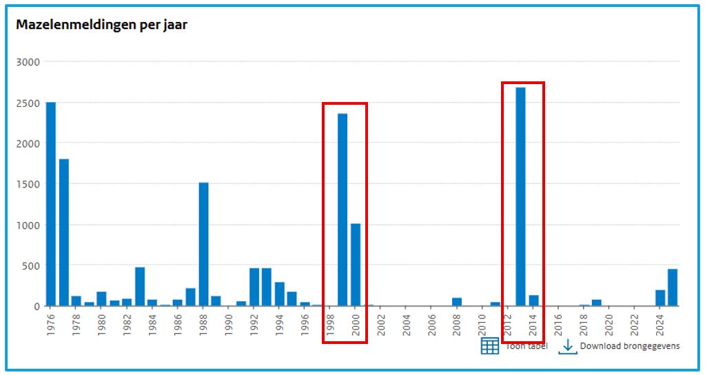 In Nederland hebben zich in 1999 en 2013 zijn er twee grote mazelen epidemieën voorgedaan (afb 1). De BMR vaccinatiegraad was toen in