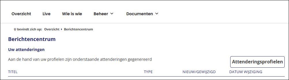 Door op “Beheer” en daarna op “Berichtencentrum” te klikken kom je op een webpagina met je attenderingen die aan de hand van je gekozen profiel zijn gegenereerd.