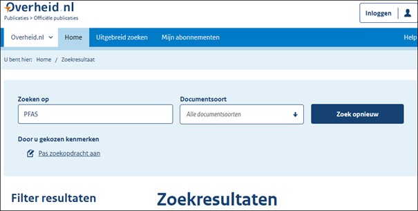 In de database van de overheid kan je zoeken naar stukken over bijvoorbeeld het onderwerp PFAS. Gebruik daarvoor de volgende link: