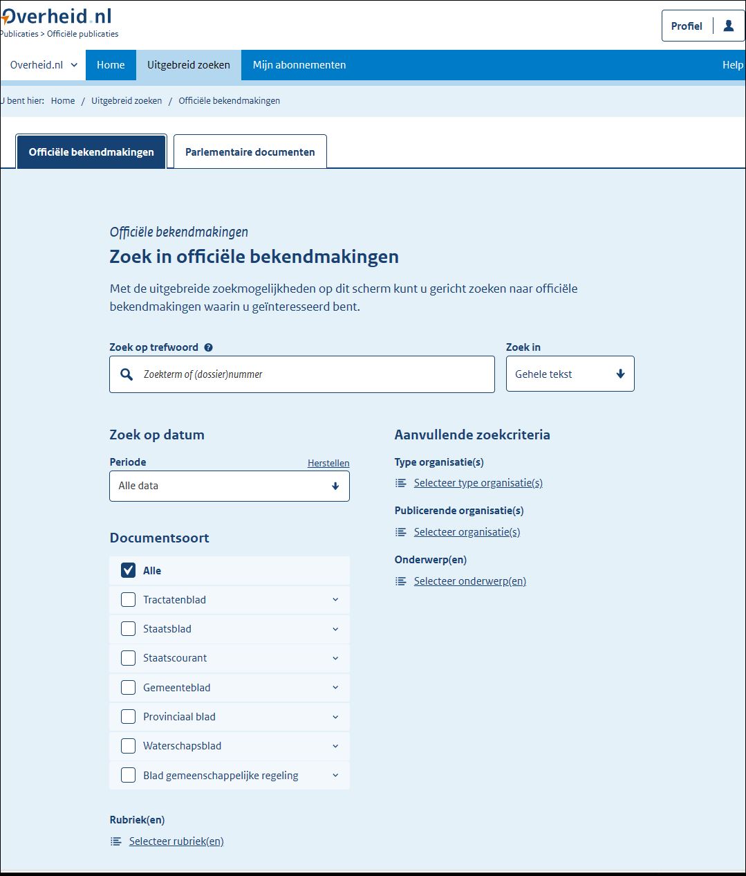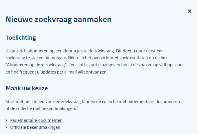 Volg daarna dezelfde handelingen als hiervoor is beschreven bij het aanmaken van een zoekvraag voor de Officiële bekendmakingen.
