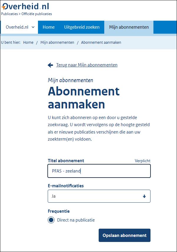 Vul bij “Titel abonnement” bijvoorbeeld in: PFAS Zeeland.