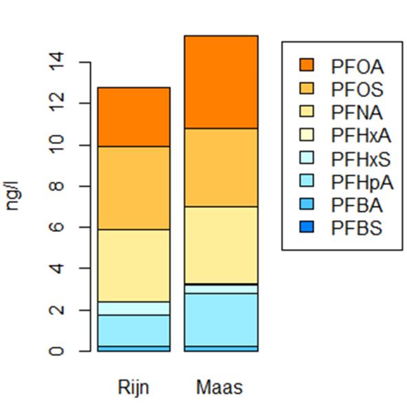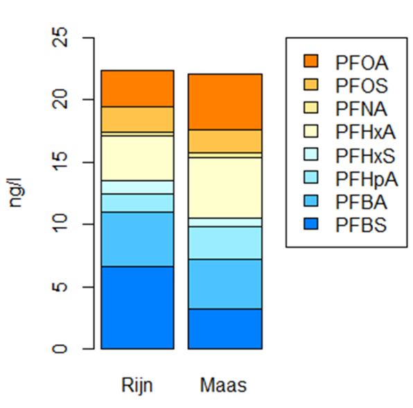 Uit de meetwaarden over 2019-2020 valt op te maken dat de samenstelling van de PFAS in de Rijn en de Maas verschilt. De concentratie PFAS voor alle locaties waar PFAS zijn gerapporteerd is in beide rivieren vrijwel gelijk aan 22 ng/L.