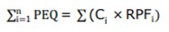 In een mengsel dat verschillen varianten van PFAS bevat kunnen we nu van elke component de PEQ-waarde bepalen. Dat doen we door de concentratie (C) in nanogrammen per liter (ng/L) van een PFAS-verbinding met de RPF van die PFAS te vermenigvuldigen. De PEQ-waarde wordt uitgedrukt in het aantal nanogrammen PFOA-equivalenten per liter (ng PEQ/L)
