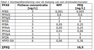 In dit voorbeeld is de ∑PEQ met 16,5 ng PEQ/L bijna vier keer zo hoog als de drinkwaterrichtwaarde van 4,4 ng PEQ/L. De conclusie is dat dit monster niet voldoet aan de drinkwaterrichtwaarde.