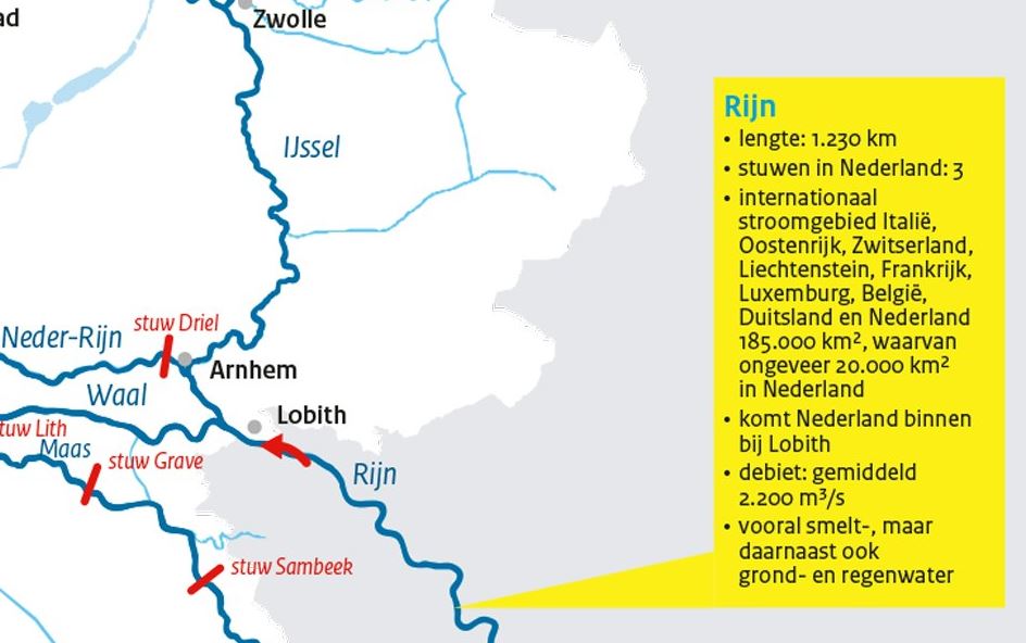 Gemiddeld debiet Rijn: 2200 m3/s (2.200.000 liter per seconde).