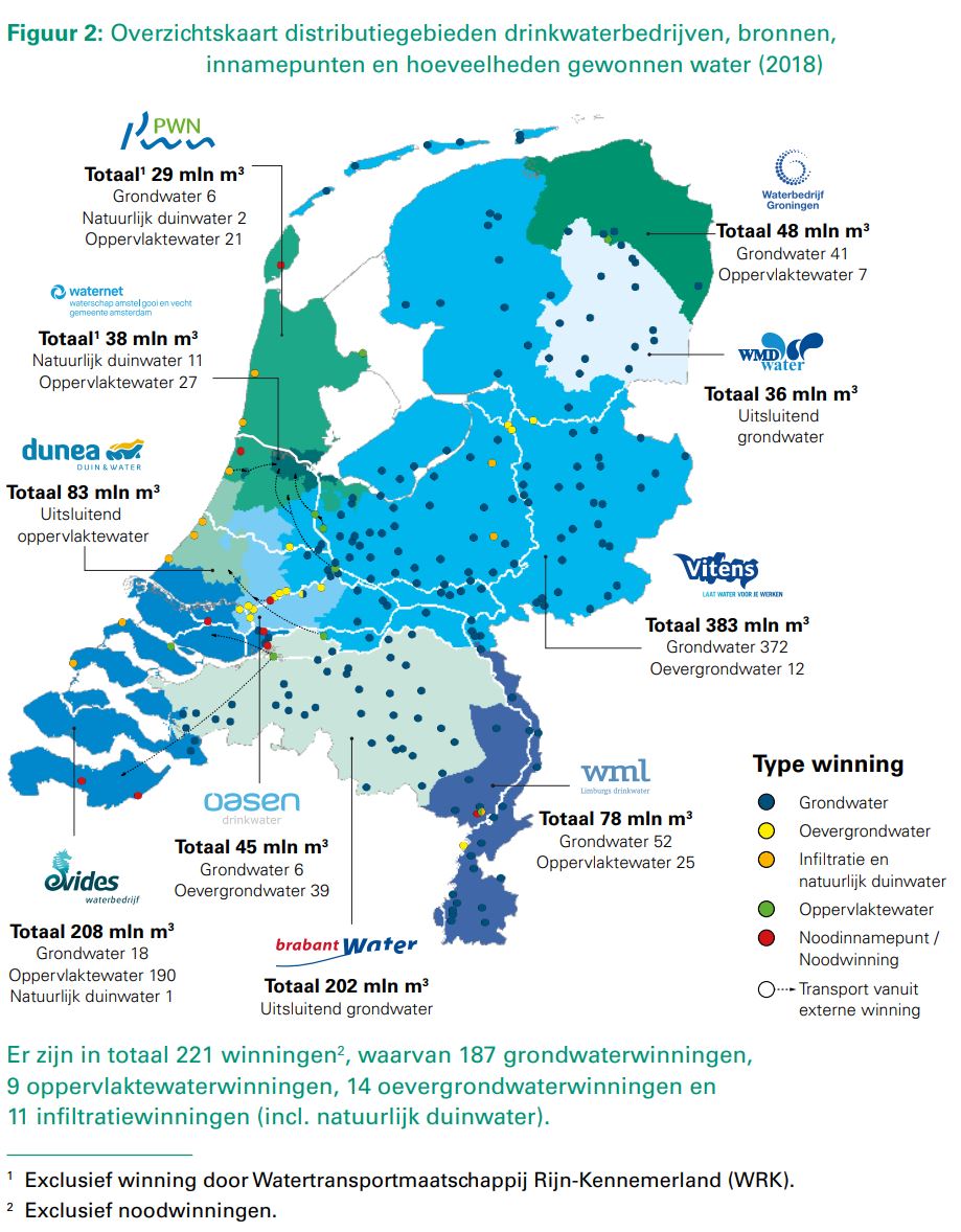 Van het drinkwater in Nederland wordt 60% gemaakt van grondwater. De overige 40% van het drinkwater wordt gemaakt van oppervlaktewater. De onderstaande kaart geeft een overzicht van de bronnen die worden gebruikt en waar deze zich bevinden.