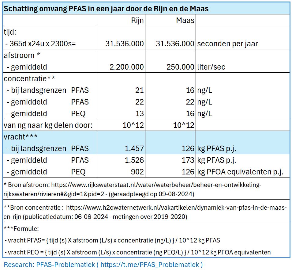 Totaal komt er 1.583 (=1.457+126) kg PFAS ons land binnen via de Rijn en de Maas.